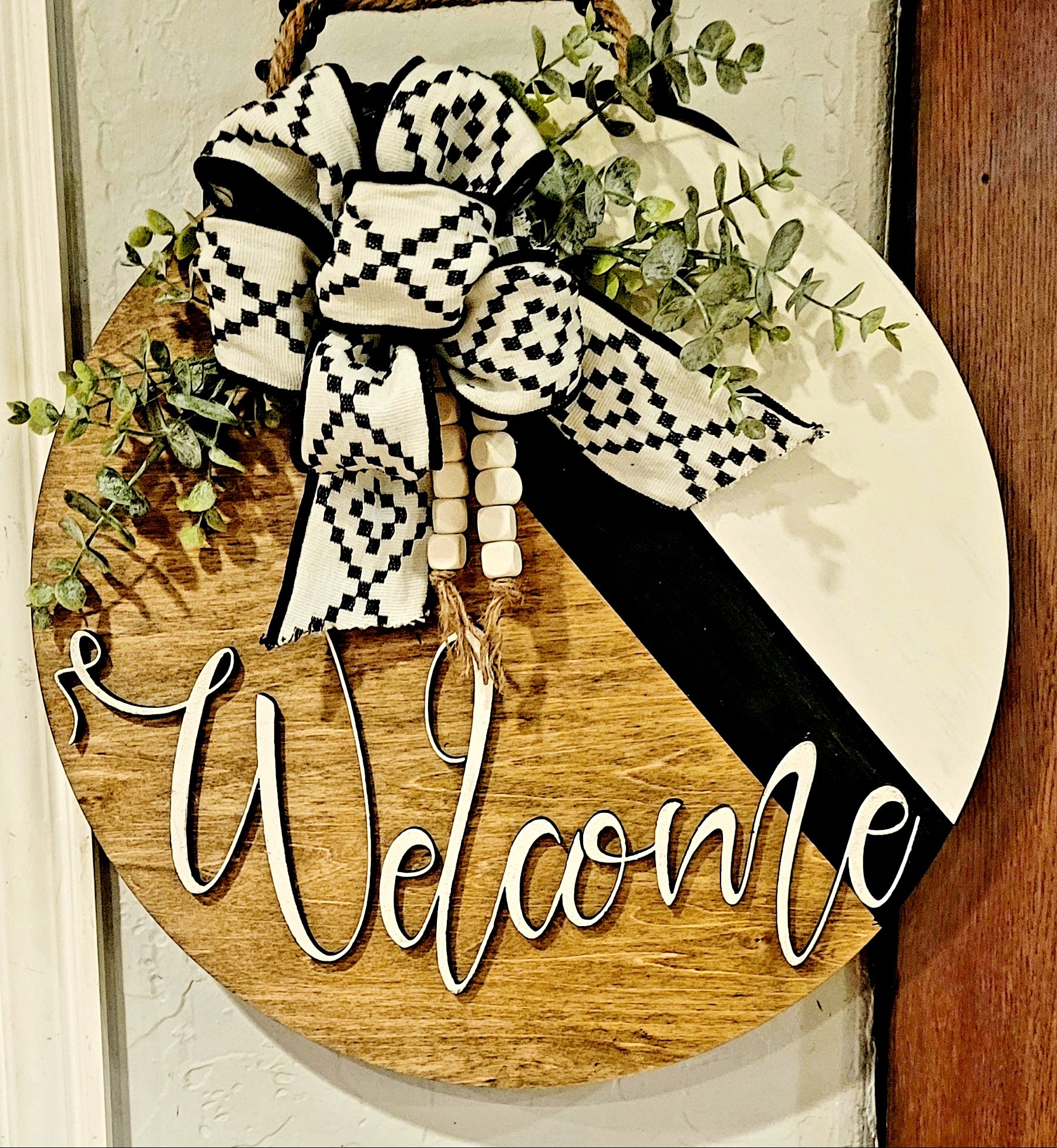 Elevate your home's entrance with our meticulously handcrafted wooden door hanger. Richly stained and gently painted in harmonious shades, this piece beautifully captures the essence of rustic elegance. It boasts a prominent 'Welcome' scripted in a creamy hue, which stands out against the natural wood grain backdrop. The door decor is further accentuated with an Aztec-inspired ribbon in contrasting black and cream, delicate bead detailing, and a touch of faux greenery, adding depth and character. Designed to offer a stylish and inviting ambiance, it's the ideal accessory to greet your guests with warmth and sophistication.